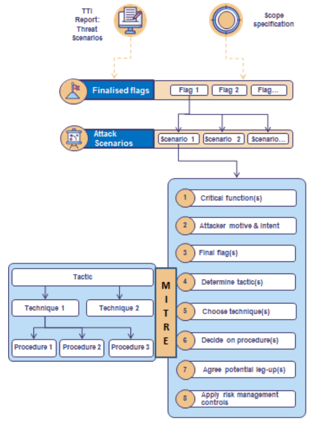 The TI team will provide threat intel tailored to the CFI, whereas the Red Team will simulate the chosen threat actors’ modi operandi according to the TTI report.